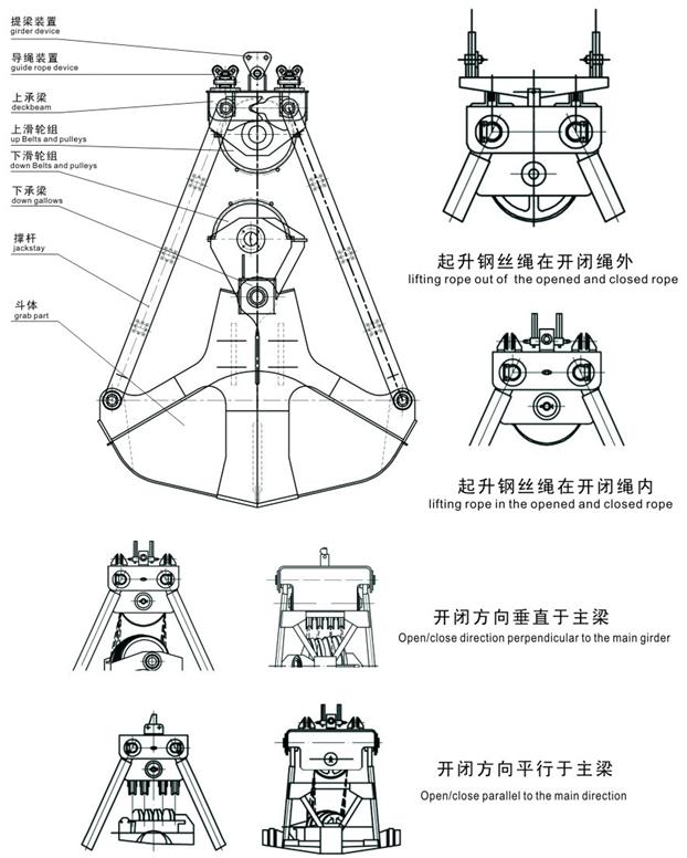 I alle typer kran med to grupper motorkraft (motor heise), fører hver motormotor durm to ledningstenger, de lager en gruppe wire tovrotter i balanserammen for å støtte, en annen gruppe av ståltråd passerer oppstrålehjulet og den nedre strålehjulet, kompositt en skiveblokk som åpen og nærbar bøtte.